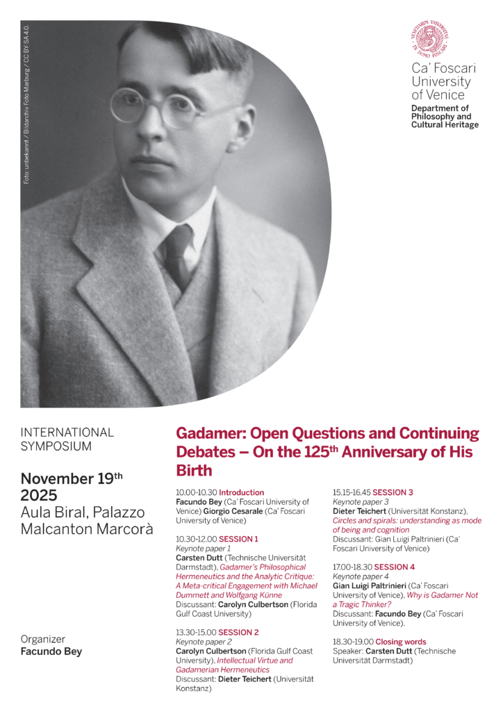 On the occasion of the 125th birthday of Hans-Georg Gadamer, the Department of Philosophy and Cultural Heritage at Ca’ Foscari University of Venice will host the symposium »Gadamer: Open Questions and Continuing Debates« on Thursday, November 19, 2025. The event is organized by Facundo Bey. Speakers include Carsten Dutt (Technical University of Darmstadt), Carolyn Gulbertson (Florida Gulf Coast University), Dieter Teichert (University of Konstanz), and Gian Luigi Paltrinieri (Ca’ Foscari University of Venice).